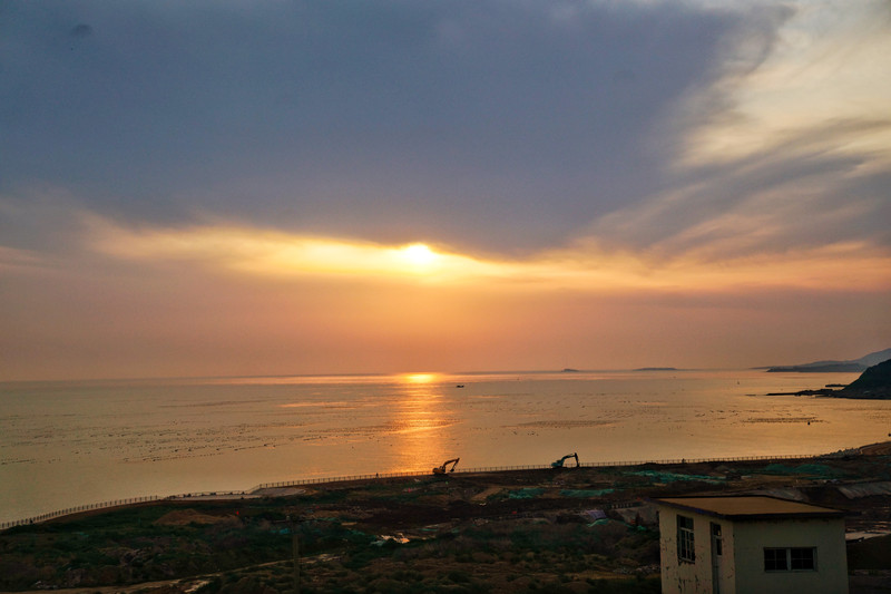 而準(zhǔn)備啟程返家的清晨,晨起7點(diǎn)鐘,還有建筑的影子落在前方,光明與陰暗在眼前交匯,更遠(yuǎn)處,是早就明亮起來(lái)的土地,藍(lán)的醉人的海與天。海上零星飄著的漁船,像極了空中的繁星點(diǎn)點(diǎn)。