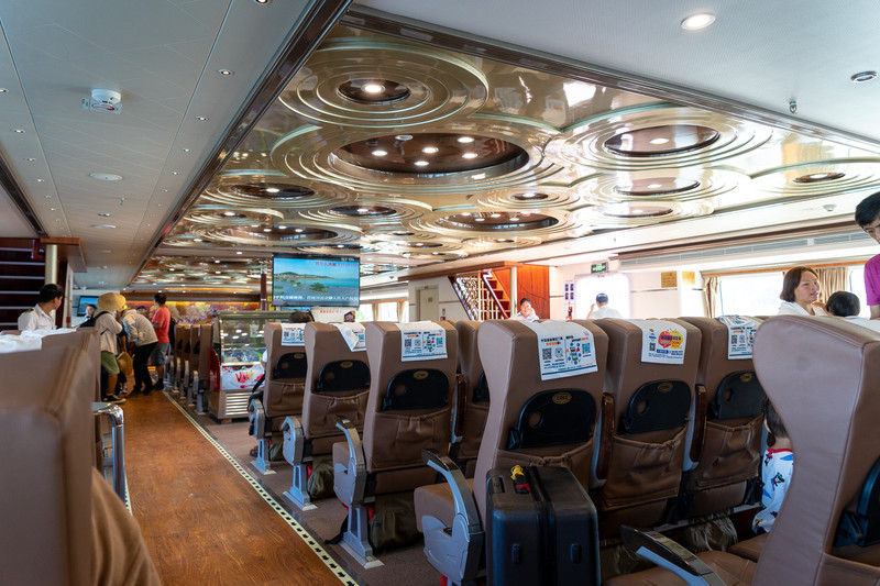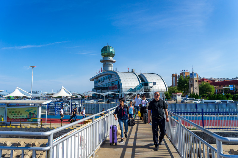 返程時(shí)買(mǎi)的船票是豪華客船,票價(jià)比普通客船略高,當(dāng)然待遇也提升了。來(lái)時(shí)室外的硬邦邦冰冰涼的椅子,換成了裝飾考究的船艙內(nèi)的皮沙發(fā)。整艘船在行駛中也更加的穩(wěn)當(dāng),速度也略快。正玩兒著手機(jī),被朋友提醒“到了”,我才回過(guò)神來(lái),匆匆去提行李箱。