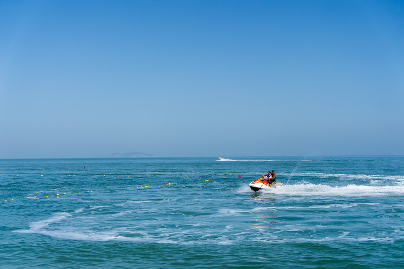 上午10點(diǎn)多,日光開(kāi)始灼熱起來(lái)。有游客騎上摩托艇,到海中與這碧水近距離接觸,濺起水花陣陣。在岸邊看海,與駛在海上,一定是兩種完全不同的感受。