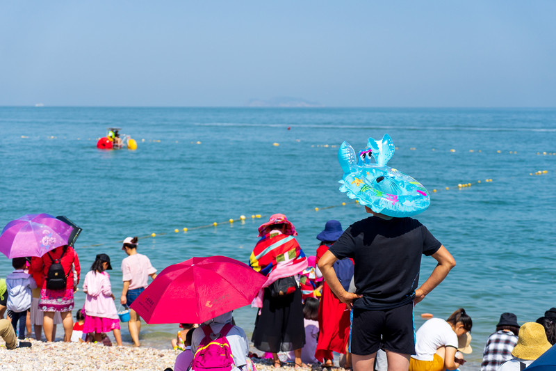 拿著相機(jī)瞎溜達(dá)拍照,偶然瞥見(jiàn),有游客把螃蟹狀的游泳圈套在頭上,當(dāng)遮陽(yáng)帽。游泳圈萌萌的,一看就是搶了自己家娃兒的游泳工具,這反差萌生生把我逗樂(lè)了哈哈。