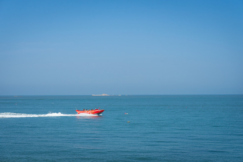 天氣好的不像話,跟同行的朋友感慨,怎樣的壞心情,到了這樣的天氣里,總能晾曬干凈,變得干燥而溫?zé)帷<t色的小船快速的駛過(guò),將這大片藍(lán)色點(diǎn)亮。