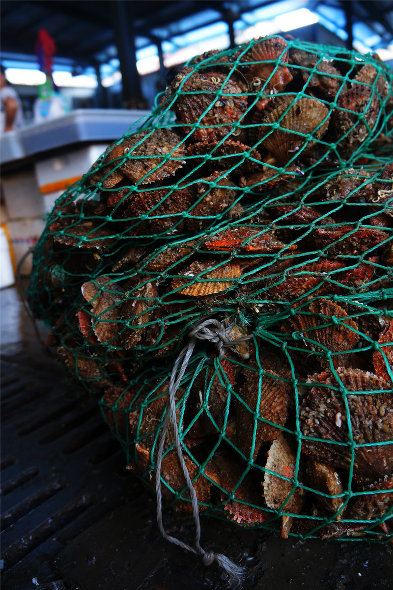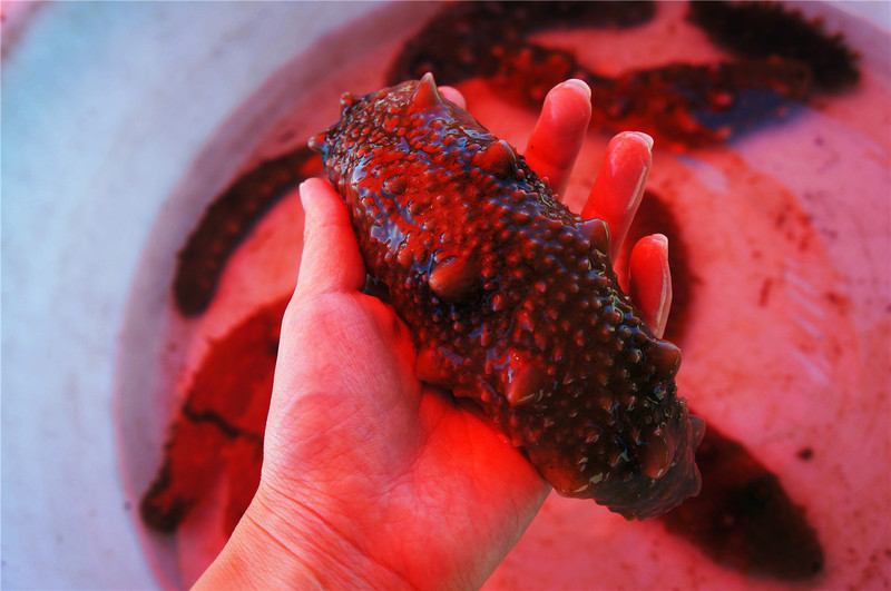 新捕的大海參實在誘人,賣家慷慨地借給我一只合影留念。^0^