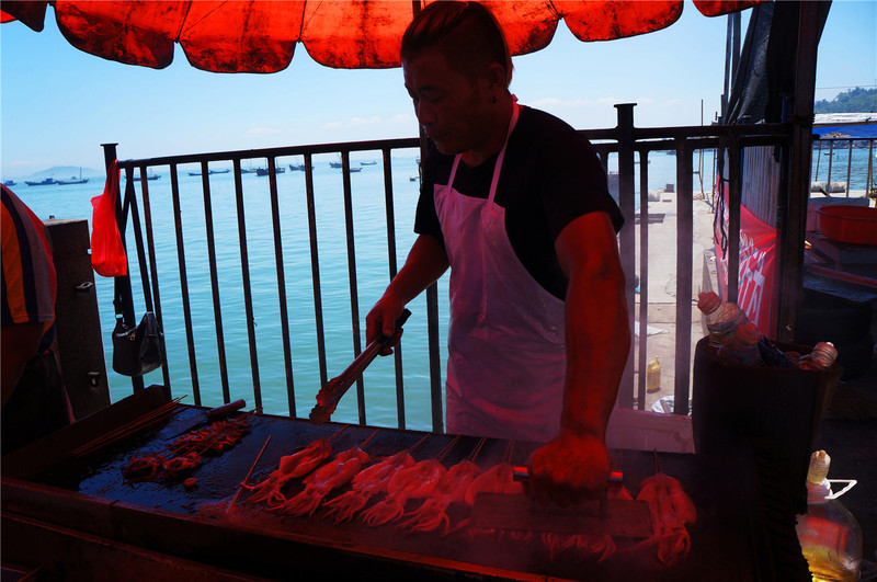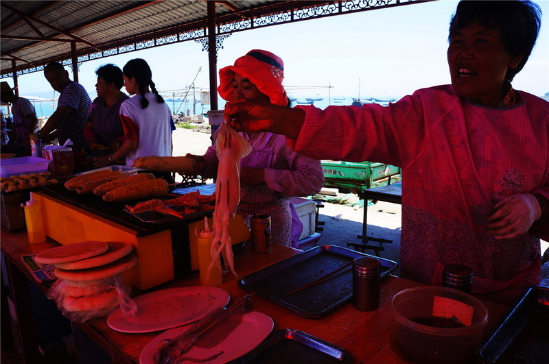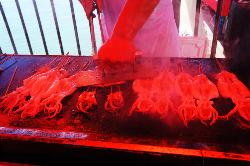 長島的朋友推薦我們一定嘗嘗廟島碼頭上的烤魷魚。